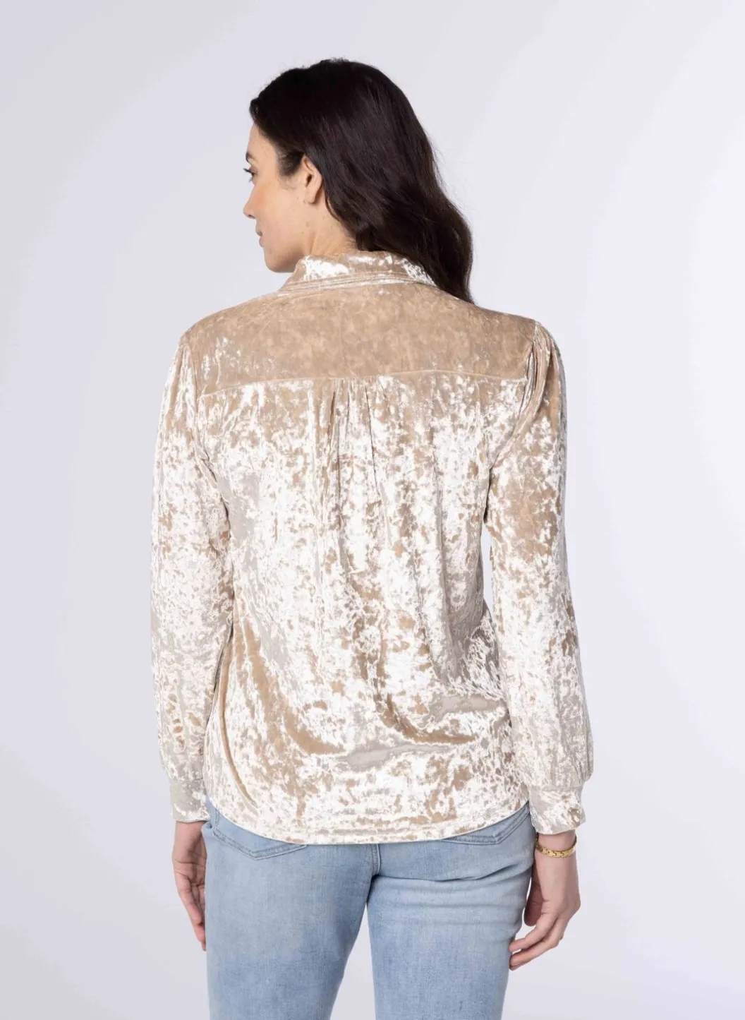 Een Beige Gekleurde Velvet Blouse Met Een Klassieke Kraag En Lange Pofmouwen Met Een Brede Manchet. De Blouse Heeft Twee Voorzakken, Een Knoopsluiting En De Schouders Als Zowel De Achterkant Is Versierd Met Gestikte Plooien.