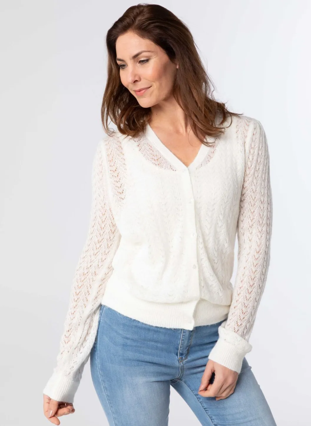 Een Zacht Vest Met Een V-Hals En Een Gebreid Patroon, Waardoor Het Vest Een Lichte, Doorschijnende Uitstraling Heeft. Bovendien Heeft Het Vest Een Knoopsluiting En Lange Mouwen Met Manchetten Voor Extra Stijl En Comfort. Het Perfecte Kledingstuk Om Elke Outfit Een Vleugje Elegantie Te Geven.