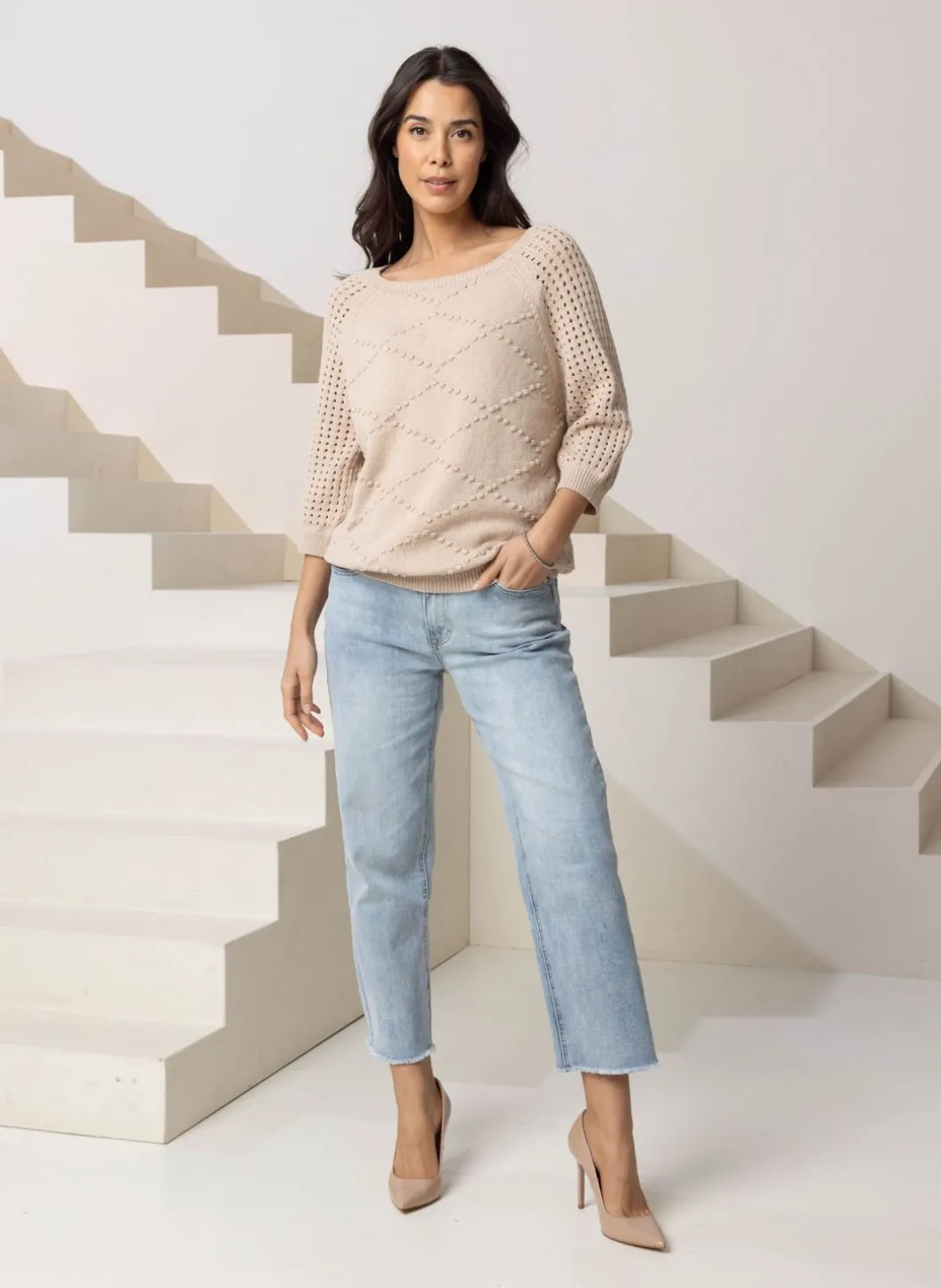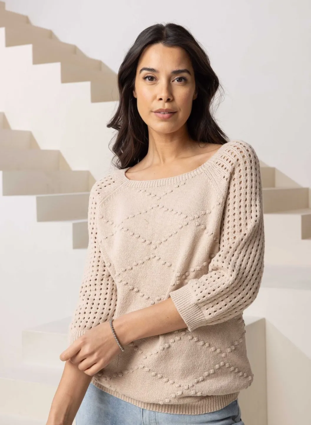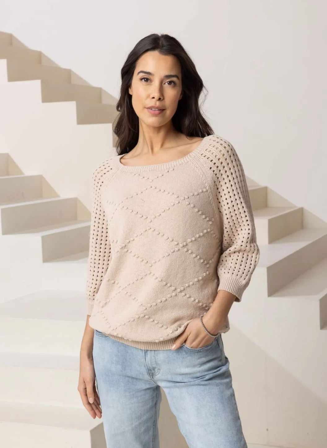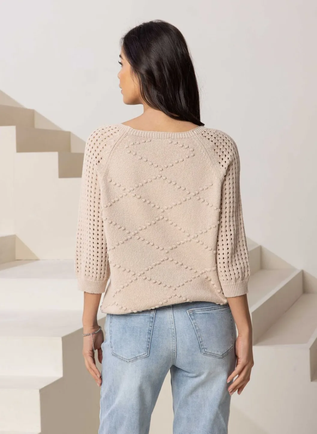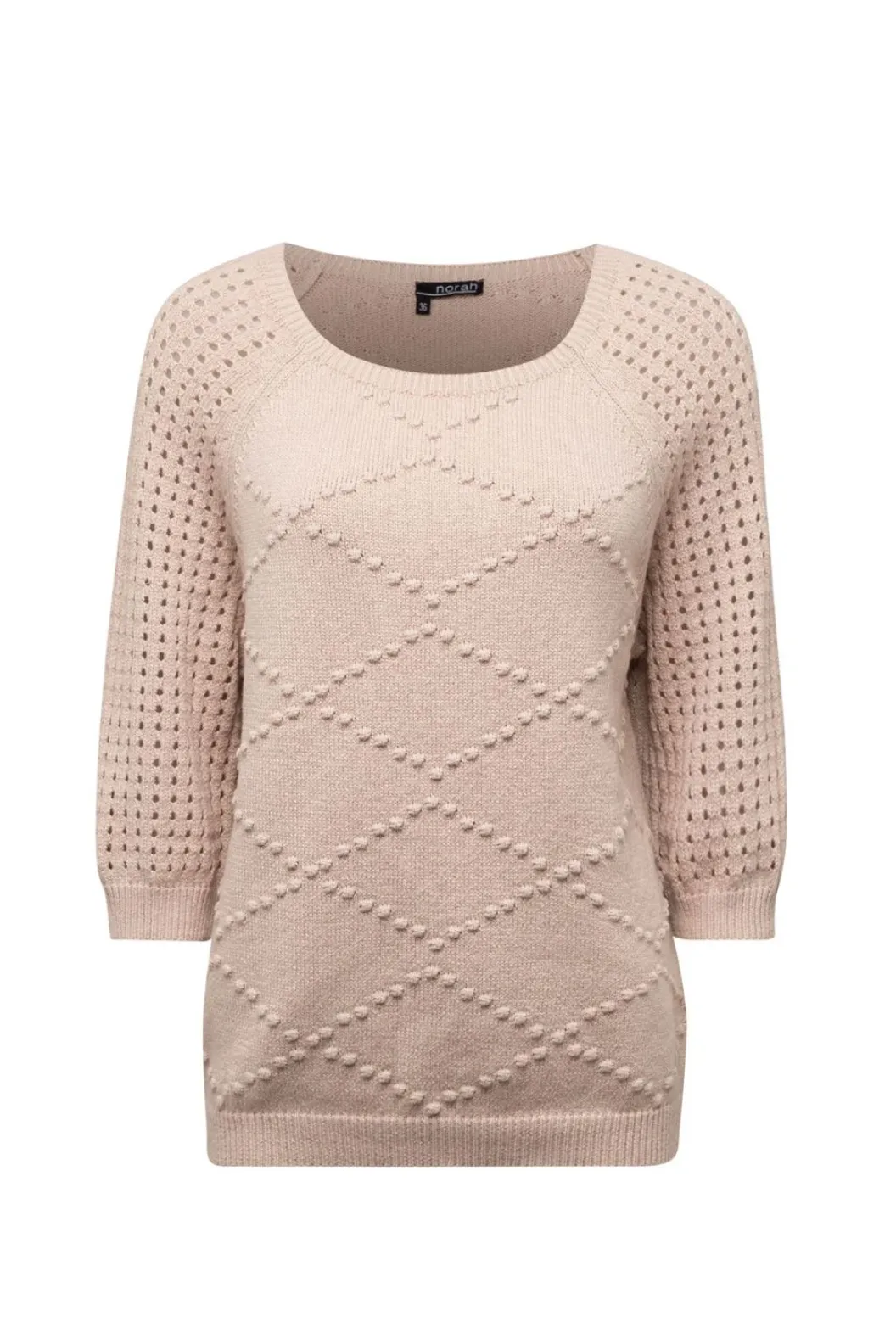 Zandkleurige Trui Met Ajour Mouwen, Een Wijde Ronde Hals. De Gebreide Ruitpatroon Is Zowel Aan De Voorkant Van De Trui Als De Achterkant Verwerkt.