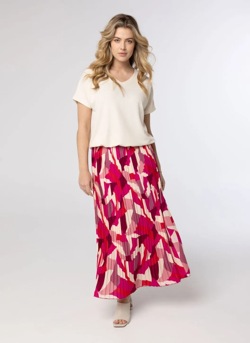 Dit Zandkleurige Shirt Met V-Hals En Aangeknipte Mouwen Heeft Veel Stretch En Een Streeppatroon In De Effen Stof. De Elastieke Band Onderaan Zorgt Voor Een Bloezend Effect.