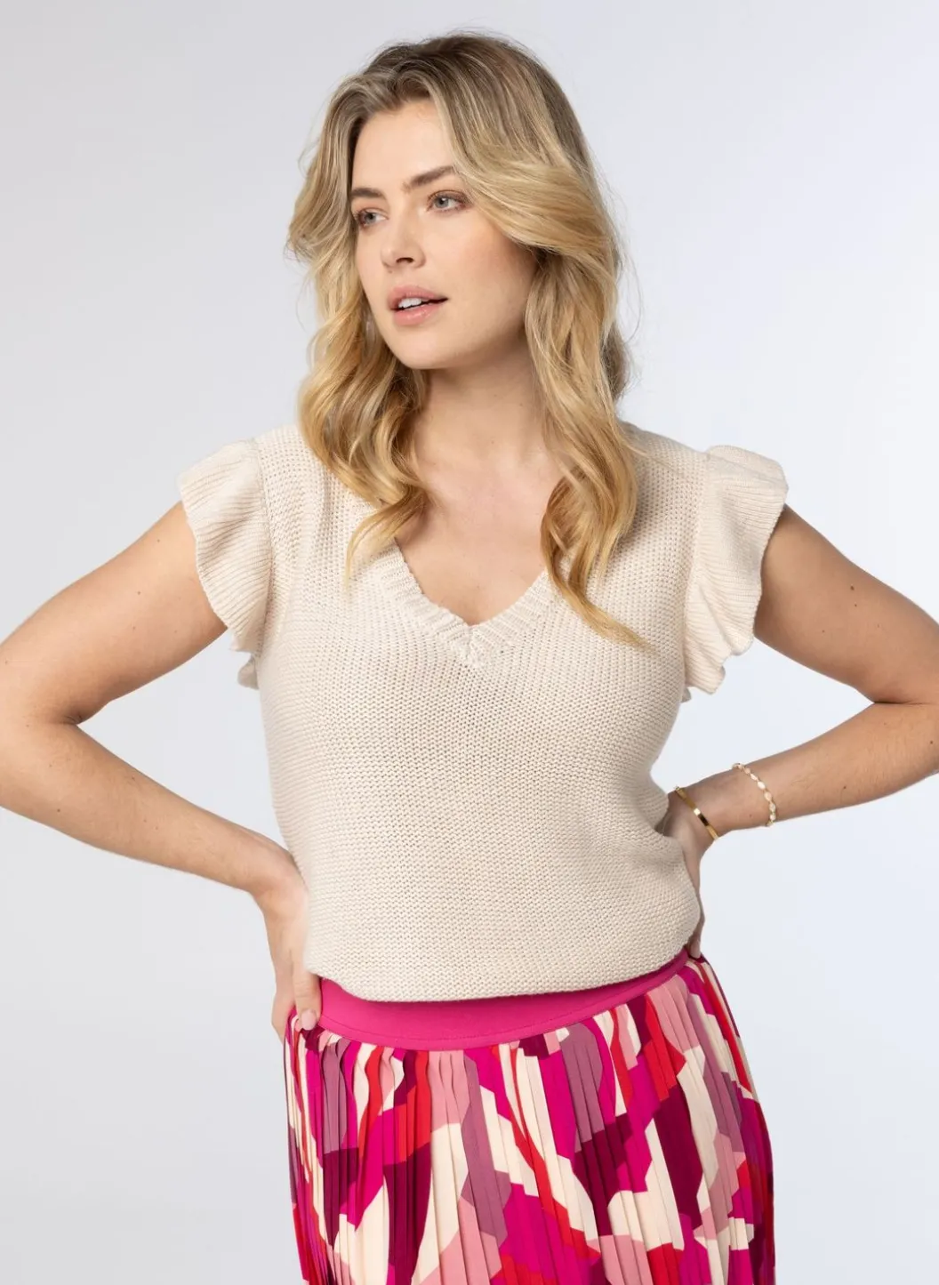 Grof Gebreide Trui Van Zandkleur Met V-Hals En Een Korte Mouw Met Ruches.