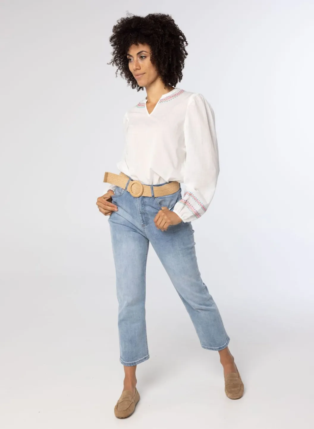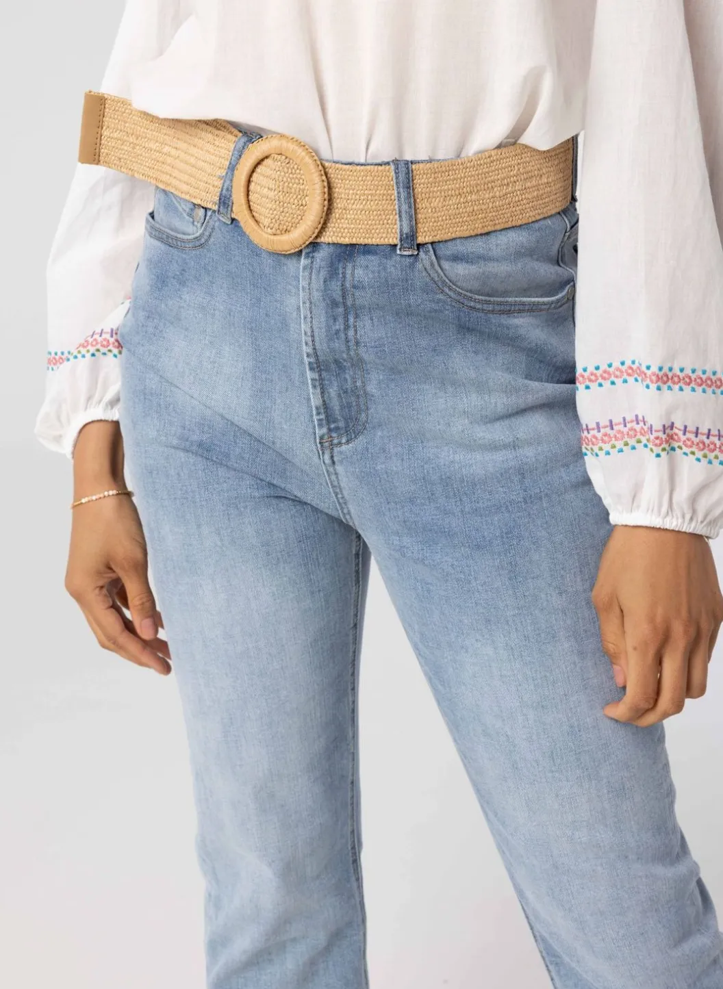 Een Zandkleurige Riem Met Rieten Look. De Ronde Gesp Heeft Dezelfde Zandkleur.